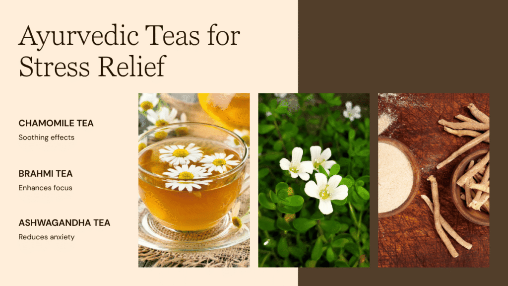 - Evening: Wind down with Ayurvedic teas for stress relief like ashwagandha or chamomile