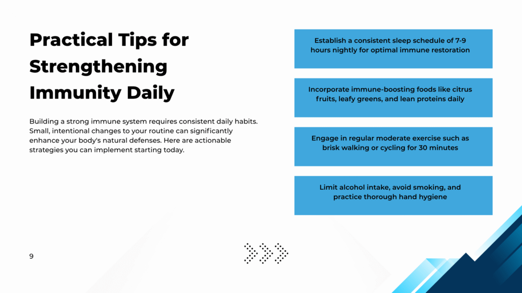 Sleep often feels negotiable, but we’ve seen firsthand how even one night of poor rest makes us sluggish and more prone to colds. Prioritizing consistent sleep—shutting screens early, sipping calming herbal teas, and keeping a quiet, dark environment—becomes an immune system strengthening tip that’s simple yet powerful. Over time, it helps us build strong immunity without medicines, boosting energy and resilience naturally.