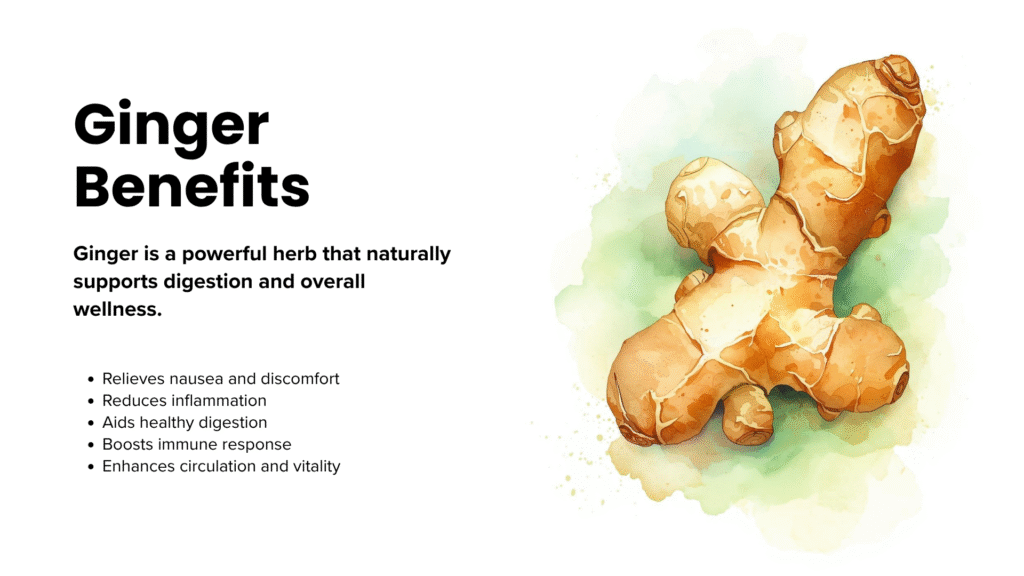 | Ginger | Boosts metabolism, reduces nausea | Anytime | Detox and warmth |