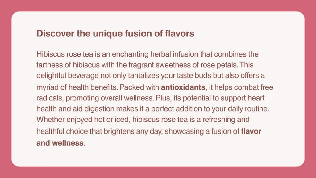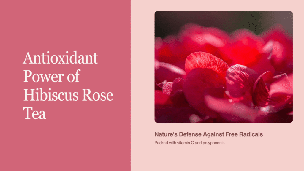 • Powerful antioxidants. Hibiscus gets its vibrant red color from anthocyanins, which help protect your cells from oxidative damage. Rose petals bring their own arsenal—flavonoids, polyphenols, and a good dose of vitamin C.