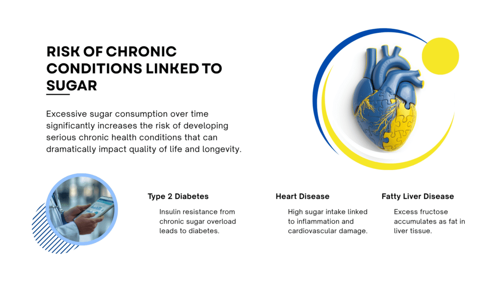 Repeated sugar intake can lead to insulin resistance, which means your body stops handling glucose efficiently. This imbalance often leads to constant hunger-like signals—even when you’ve eaten enough.