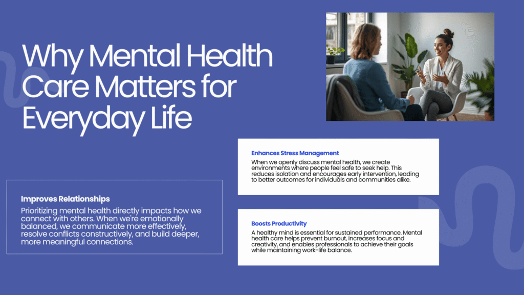 Productivity isn’t just about doing more—it’s about doing things with clarity. When our mind feels cluttered, even simple tasks feel exhausting. Mental Health Care helps us clear that mental noise so we can focus better. We stop jumping between tasks and start completing them with intention. Over time, this shift helps us stay productive without constantly feeling drained.