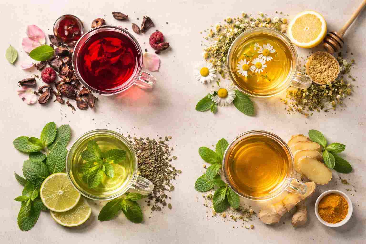Herbal teas are caffeine-free or naturally low in stimulants and are made from flowers, roots, seeds, leaves, and spices known for their therapeutic properties.
