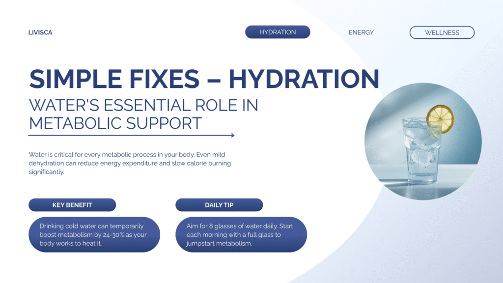 This one sounds almost too simple, but dehydration really does slow things down. We noticed fatigue and headaches on days we didn’t drink enough water. And sometimes, what felt like hunger was just dehydration. Among the Simple Fixes for Slow Metabolism Naturally, this is probably the easiest to start. Warm fluids, especially in the morning or between meals, helped digestion feel smoother. Even small habits like keeping a bottle nearby made a difference.